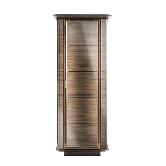 Витрина Margherita с одной дверцей, выполненная из ореха Каналетто и тика, с элегантными внутренними полками и встроенной светодиодной подсветкой.