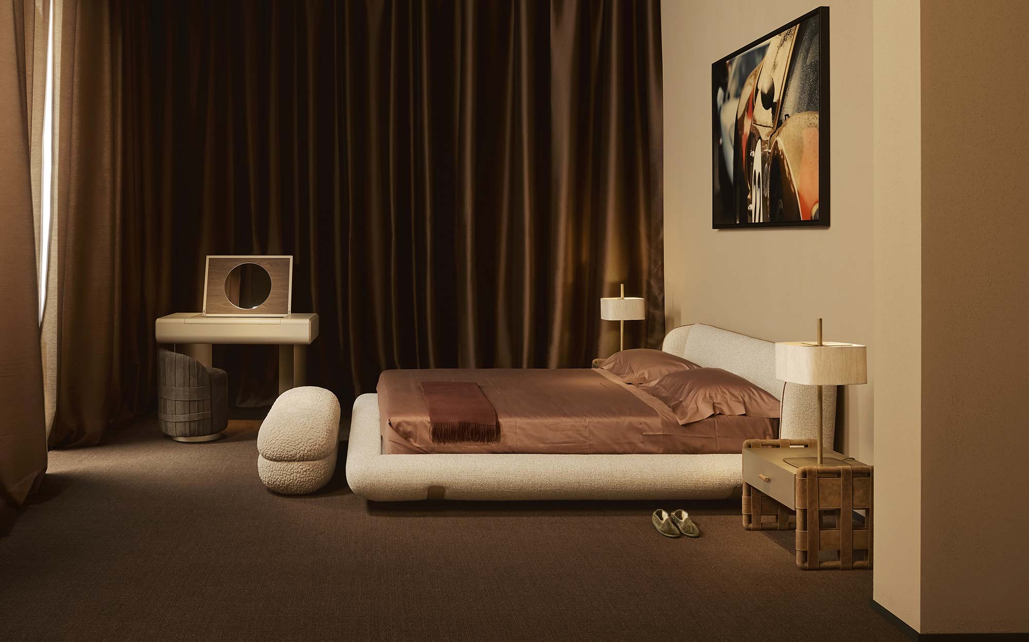 Daytona переосмысляет роскошь как тактильное и визуальное переживание. Мягкие линии, благородные материалы, динамичные формы создают уникальную атмосферу. Шпон ореха каналетто, набук, мрамор и сталь формируют идеальное пространство для отелей и элитных резиденций.