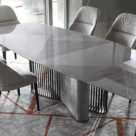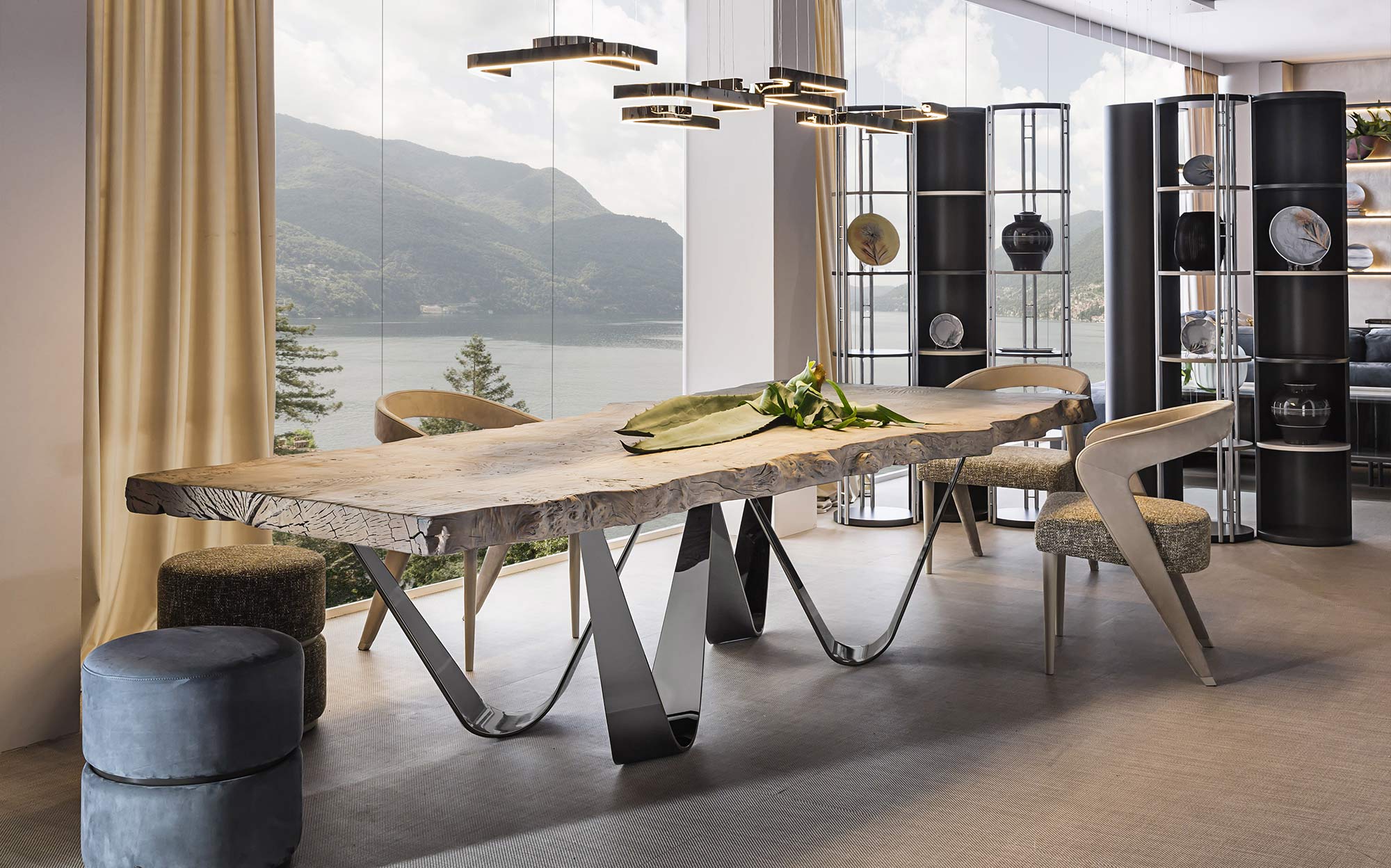 Следующая сцена принадлежит Giorgio Collection. Здесь итальянское мастерство работы с деревом сочетается с металлом в элегантной геометрии. Полированная поверхность и четкие пропорции создают язык обеденных столов премиум-класса, которые поднимают интерьер на новый уровень.