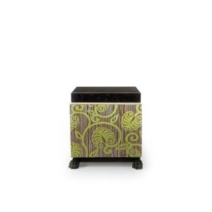 Тумбочка Veio от Sergio Villa — сочетание древнего вдохновения и выразительного дизайна. Лакированная структура с отделкой Etruska, ножки в виде львиных лап из бронзы, фасад из дерева «тысяча прожилок», украшенный золотыми и серебряными штрихами и зелёными светящимися завитками. Эффектная деталь интерьера для спальни класса люкс.